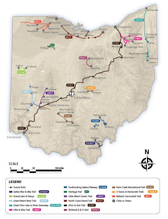 Known as Route 1 in Ohio, the Ohio to Erie Trail (OTET), will lead any adventurous individual from Cincinnati, at the symbolic landmark of the John A. Roebling Suspension Bridge, and will guide you northward to the sandy shores of Lake Erie in Cleveland.